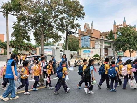 在学校门口,护学人员引导学生有序排队过马路,提醒他们保持安全距离,注意交通安全。对于低年级的学生,护学人员还会主动上前帮忙提拿书包,护送他们安全通行。在学校周边道路,护学人员协助维护交通秩序,引导车辆有序通行,劝阻乱停乱放、随意调头等违规行为,确保道路畅通。遇到横穿马路的学生,护学人员会及时上前制止,并护送他们安全通过马路。针对部分家长违规占道停车、电动车逆行等问题,护学人员采取“柔性劝导+普法宣传”的方式,向家长发放《文明出行倡议书》,讲解交通法规,有效缓解了放学时段校门口的拥堵状况。