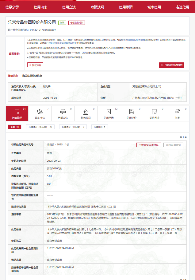 近日imtoken官网app,南京市财政局依法对乐禾食品集团股份有限公司(以下简称"乐禾公司")在政府采购项目中的违法行为作出行政处罚决定(宁财罚﹝2025﹞1号),处以5.01万元罚款。